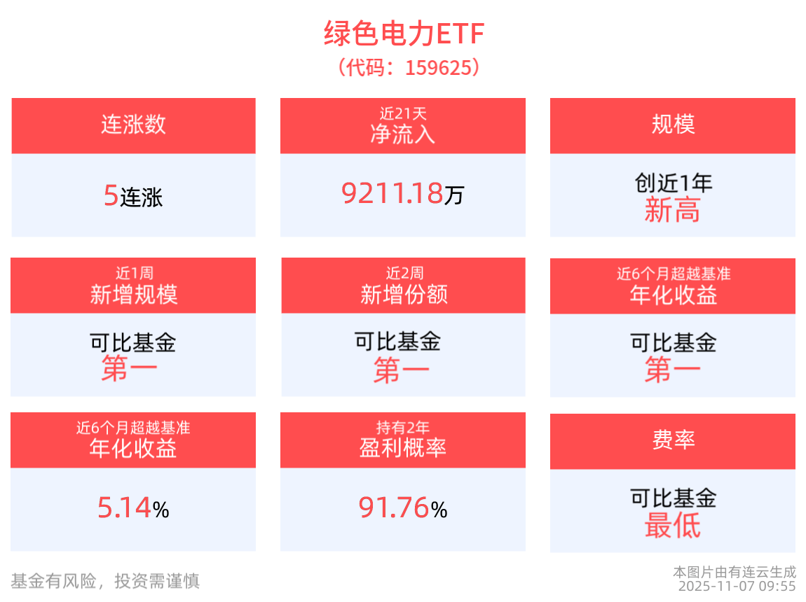 绿色电力ETF(159625)盘中涨近1%冲击5连涨,最新规模创近1年新高!