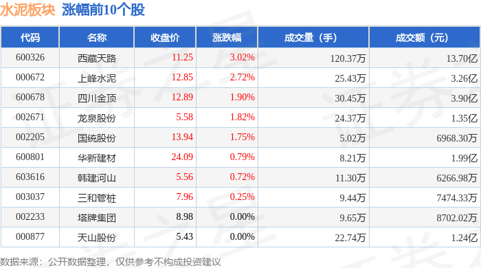 水泥板块市场表现 - 2025年1月16日,水泥板块整体下跌0.92%,表现弱于大盘,当日上证指数下跌0.26%,深证成指下跌0.18% [1] - 板块内个股表现分化,西藏天路领涨,涨幅为3.02%,金隅集团领跌,跌幅达9.95% [1][2] - 板块整体成交活跃,西藏天路成交额达13.70亿元,海螺水泥成交额为7.64亿元,金隅集团成交额为6.00亿元 [1][2] 个股涨跌情况 - 涨幅居前的个股包括:西藏天路(3.02%)、上峰水泥(2.72%)、四川金顶(1.90%)、龙泉股份(1.82%)、国统股份(1.75%) [1] - 跌幅居前的个股包括:金隅集团(-9.95%)、海南瑞泽(-1.94%)、海螺水泥(-1.73%)、冀东水泥(-1.46%)、西部建设(-1.46%) [2] - 部分个股股价持平,包括塔牌集团和天山股份,涨跌幅均为0.00% [1] 板块资金流向 - 当日水泥板块整体呈现主力与游资净流入,散户净流出的格局,主力资金净流入1.26亿元,游资资金净流入3460.4万元,散户资金净流出1.61亿元 [2] - 个股中,西藏天路获得主力资金大幅净流入2.07亿元,主力净占比达15.11%,国统股份主力净流入1656.33万元,主力净占比为23.77% [3] - 部分个股主力资金净流入但游资净流出,如上峰水泥主力净流入1523.79万元,游资净流出69.79万元,天山股份主力净流入1196.06万元,游资净流出152.14万元 [3]
