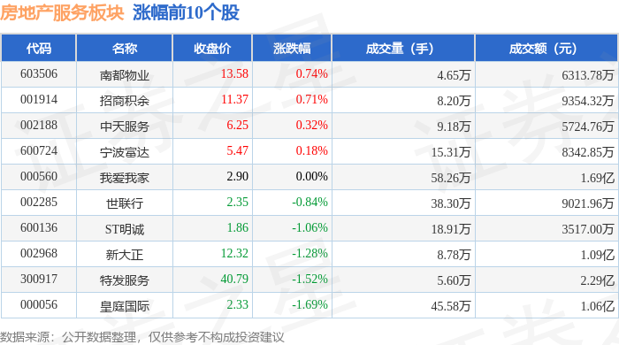 证券之星消息,10月29日房地产服务板块较上一交易日下跌0.48%,南都物业领跌。当日上证指数报收 于4016.33,上涨0.7%。深证成指报收于13691.38,上涨1.95%。房地产服务板块个股涨跌见下表: | 代码 | 名称 | 收盘价 | 涨跌幅 | 成交量(手) | 成交额(元) | | --- | --- | --- | --- | --- | --- | | 002968 | 新大正 | 12.50 | 1.46% | 8.19万 | 1.01亿 | | 001914 | 招商积余 | 11.44 | 1.42% | 5.81万 | 6597.00万 | | 300917 | 特发服务 | 41.32 | 0.66% | + 3.67万 | 1.50亿 | | 002285 | 世联行 | 2.36 | 0.43% | 30.91万 | 7225.58万 | | 000560 | 我爱我家 | 2.88 | 0.00% | 60.60万 | 1.73亿 | | 600684 | 珠江股份 | 5.52 | -1.25% | 30.52万 | 1.68亿 | | 600136 | ST明诚 | 1 ...