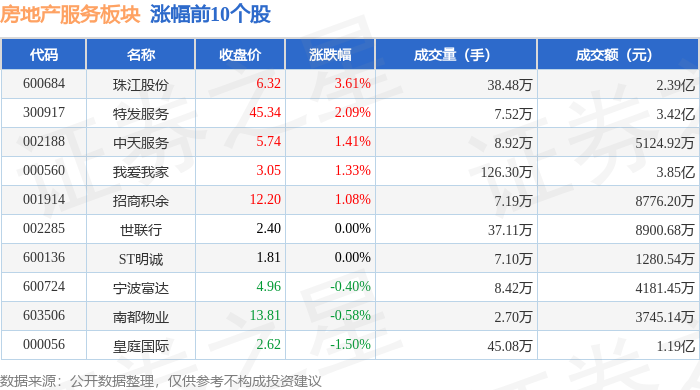 证券之星消息,9月30日房地产服务板块较上一交易日上涨0.76%,珠江股份领涨。当日上证指数报收于 3882.78,上涨0.52%。深证成指报收于13526.51,上涨0.35%。房地产服务板块个股涨跌见下表: | 代码 | 名称 | 收盘价 | 涨跌幅 | 成交量(手) | 成交额(元) | | --- | --- | --- | --- | --- | --- | | 600684 | 珠江股份 | 6.32 | 3.61% | 38.48万 | 2.39亿 | | 300917 | 特发服务 | 45.34 | 2.09% | 7.52万 | 3.42亿 | | 002188 | 中天服务 | 5.74 | 1.41% | 8.92万 | 5124.92万 | | 000560 | 我爱我家 | 3.05 | 1.33% | 126.30万 | 3.85亿 | | 001914 | 招商积余 | 12.20 | 1.08% | 7.19万 | 8776.20万 | | 002285 | 世联行 | 2.40 | 0.00% | 37.11万 | 8900.68万 | | 600136 | ST明诚 | ...