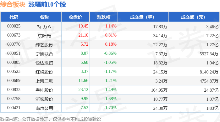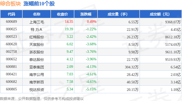 证券之星消息,11月21日综合板块较上一交易日下跌5.33%,三木集团领跌。当日上证指数报收于 3834.89,下跌2.45%。深证成指报收于12538.07,下跌3.41%。综合板块个股涨跌见下表: | 代码 | 名称 | 主力净流入(元) | 主力净占比 游资净流入 (元) | | 游资净占比 散户净流入 (元) | | 散户净占比 | | --- | --- | --- | --- | --- | --- | --- | --- | | 000652 泰达股份 | | 915.51万 | 9.62% | 416.42万 | 4.37% | -1331.92万 | -13.99% | | 600689 上海三毛 | | 636.40万 | 6.79% | 174.56万 | 1.86% | -810.96万 | -8.66% | | 600805 悦达投资 | | 512.95万 | 4.68% | 569.97万 | 5.21% | -- - 1082.92万 | -9.89% | | 600051 | 宁波联合 | -49.39万 | -0.55% | 460.18万 | 5.14% | -410.7 ...