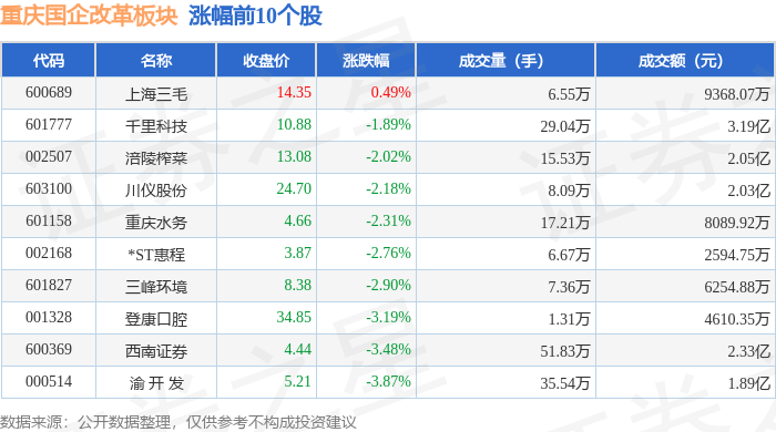 证券之星消息,11月21日重庆国企改革板块较上一交易日下跌2.76%,渝三峡A领跌。当日上证指数报 收于3834.89,下跌2.45%。深证成指报收于12538.07,下跌3.41%。重庆国企改革板块个股涨跌见下表: | 代码 | 名称 | 收盘价 | 涨跌幅 | 成交量(手) | 成交额(元) | | | --- | --- | --- | --- | --- | --- | --- | | 000565 | 渝三峡A | 7.15 | -6.04% | 21.41万 | | 1.56亿 | | 600279 | 重庆港 | 5.01 | -5.29% | 18.89万 | | 9672.91万 | | 600939 | 重庆建工 | 3.51 | -4.36% | 36.72万 | | 1.31亿 | | 000950 | 重药控股 | 5.16 | -4.09% | 1 31.74万 | | 1.66亿 | | 000514 | 渝开发 | 5.21 | -3.87% | 35.54万 | | 1.89亿 | | 600369 | 西南证券 | 4.44 | -3.48% | 51.83万 | | 2. ...