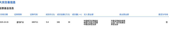 交易概况 - 2025年10月15日,盛屯矿业发生一笔大宗交易,成交量为30万股,成交额为282万元 [1] - 该笔大宗交易成交价9.4元,较当日市场收盘价11.26元折价16.52% [1] - 该笔交易成交额占公司当日总成交额的0.06% [1] 交易细节 - 交易证券简称为盛屯矿业,证券代码为600711 [2] - 买入营业部为有限公司任务监控,卖出营业部为委員严格與農園 [2]