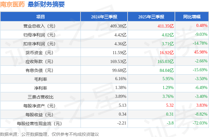 智通财经APP讯,南京医药(600713.SH)披露2025年第三季度报告,公司前三季度实现营收411.35亿元, 同比增长0.48%;归母净利润4.02亿元,同比下降9.03%;扣非净利润3.71亿元,同比下降14.78%;基本每股 收益0.31元。 ...