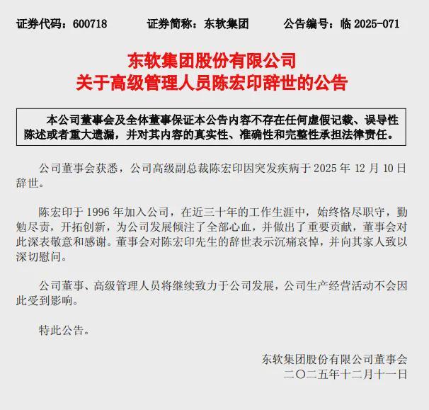 东软集团(600718.SH)今日公告称, 公司高级副总裁陈宏印因突发疾病于2025年12月10日辞世。 陈宏印于1996年加入公司,为公司发展做出了重要贡献。董事会对陈宏印的辞世表示沉痛哀悼,并向其家人致以深切慰问。公司生产经营活动不会因此受 到影响。 准确 快速 权威 专业 7x24h电报 头条新闻 VIP资讯 实时盯盘 | 东软集团(600718) | | --- | 12-11 17:23:53 沪 融 | 所属行业:计算机-1.60%> 9.84 | | | | | | 查看所属板块 > | | | --- | --- | --- | --- | --- | --- | --- | --- | | -0.17 -1.70% | | 工业互联网 | | | 区块链 | | | | -1.81% 最相关 | | | | | -2.19% | | | | 4个 ਸ 10.04 | | 良 름 | | 10.04 | 成交量 | 13.8万手 | | | 昨 收 | 10.01 | 最 低 | | 9.83 | 成交额 | | 1.36亿 | | 厂家公司 172.26 | | 换手率 | | 1.16% ...