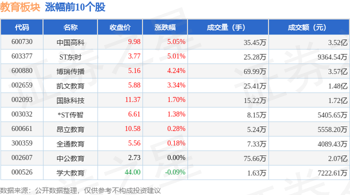 教育板块整体市场表现 - 2024年10月22日教育板块整体上涨0.74%,表现优于大盘,当日上证指数下跌0.07%,深证成指下跌0.62% [1] - 板块内个股表现分化,中国高科以5.05%的涨幅领涨,ST东时和博瑞传播分别上涨5.01%和4.24% [1] - 板块整体资金呈净流入状态,主力资金净流入1377.49万元,而游资和散户资金分别净流出522.65万元和854.84万元 [2]   领涨个股表现 - 中国高科收盘价为9.98元,涨幅5.05%,成交量为35.45万手,成交额为3.52亿元,主力资金净流入2425.97万元,占成交额的6.90% [1][3] - ST东时收盘价为3.77元,涨幅5.01%,成交量为25.28万手,成交额为9364.54万元,主力资金净流入580.56万元,占成交额的6.20% [1][3] - 博瑞传播收盘价为5.16元,涨幅4.24%,成交量为69.99万手,成交额为3.57亿元,是当日主力资金净流入最多的个股,达3829.77万元,占成交额的10.72% [1][3]   资金流向分析 - 博瑞传播、国脉科技和中国高科是主力资金主要流入对象,主力净流入金额分别为3829.77万元、2829.26万元和2425.97万元,主力净占比分别为10.72%、16.49%和6.90% [3] - 部分个股出现主力资金净流出,其中*ST国化主力净流出280.28万元,主力净占比为-16.70%,*ST传智和ST开元主力净流出分别为182.60万元和77.56万元 [3] - 游资资金在多数个股上呈净流出状态,仅学大教育等少数个股获得游资净流入318.17万元 [2][3]