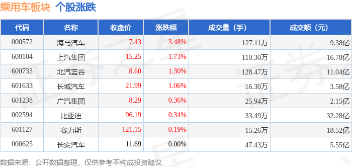 市场整体表现 - 2025年1月19日,乘用车板块整体上涨0.68%,表现强于大盘,当日上证指数上涨0.29%,深证成指上涨0.09% [1] - 板块内个股普遍上涨,领涨股为海马汽车,涨幅达3.48% [1] - 从资金流向看,当日乘用车板块整体获得主力资金净流入6355.93万元,而游资和散户资金分别净流出1756.02万元和4599.92万元 [1] 个股价格与交易表现 - 海马汽车收盘价7.43元,上涨3.48%,成交127.11万手,成交额9.38亿元 [1] - 上汽集团收盘价15.25元,上涨1.73%,成交110.30万手,成交额16.78亿元 [1] - 北汽蓝谷收盘价8.60元,上涨1.30%,成交128.47万手,成交额11.04亿元 [1] - 长城汽车收盘价21.99元,上涨1.06%,成交16.30万手,成交额3.58亿元 [1] - 广汽集团收盘价8.29元,上涨0.36%,成交25.94万手,成交额2.15亿元 [1] - 比亚迪收盘价96.19元,上涨0.34%,成交33.49万手,成交额32.28亿元 [1] - 赛力斯收盘价121.15元,上涨0.19%,成交15.26万手,成交额18.52亿元 [1] - 长安汽车收盘价11.69元,涨跌幅为0.00%,成交47.43万手,成交额5.55亿元 [1] 个股资金流向分析 - 海马汽车获得主力资金净流入7346.23万元,主力净占比达7.84%,是板块内主力资金流入最显著的个股 [2] - 上汽集团获得主力资金净流入6473.06万元,主力净占比为3.86% [2] - 长城汽车获得主力资金净流入5621.76万元,主力净占比高达15.71% [2] - 北汽蓝谷获得主力资金净流入4244.73万元,主力净占比为3.84% [2] - 广汽集团获得主力资金净流入446.70万元,主力净占比为2.08% [2] - 长安汽车遭遇主力资金净流出3807.55万元,主力净占比为-6.87% [2] - 赛力斯遭遇主力资金净流出5152.15万元,主力净占比为-2.78% [2] - 比亚迪遭遇主力资金净流出8816.85万元,是板块内主力资金流出最多的个股,主力净占比为-2.73% [2]