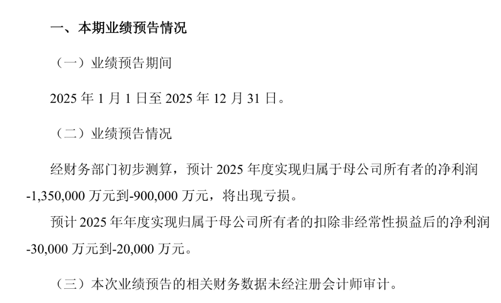业绩预测与核心亏损 - 公司预计2025年归属于母公司所有者的净利润为-90亿元至-135亿元人民币,亏损幅度显著扩大[1] - 2024年同期亏损为28.33亿元,2025年预测亏损较上年扩大[1] - 剔除非经常性损益后,公司预计2025年净利润亏损额为2亿元至3亿元,表明预亏主要源于一次性会计调整而非主营业务运营[1] 亏损核心原因与事件背景 - 业绩亏损扩大的核心原因在于2025年第四季度发生的监管变动,涉及欧洲核心子公司安世半导体控制权受限引发的重大资产减值[1][3] - 荷兰高官表示已暂停对安世半导体的干预,中方与荷方进行了多轮磋商并同意荷兰经济部派员来华[3] - 截至报告期末,尽管荷兰经济事务与气候政策部的部长令已被暂停,但阿姆斯特丹上诉法院企业法庭的裁决依然生效[3] 财务影响与不确定性 - 安世控制权受限事项对财务报表的影响具有重大不确定性,公司基于谨慎性原则决定确认较大金额的投资损失和资产减值损失[3] - 公司正与荷兰相关各方保持沟通,但沟通的进展及最终结果仍存在不确定性,可能导致业绩预告不够准确或超出预期[3] - 投资者需密切关注后续正式披露的2025年年度报告以获取准确信息[3]
