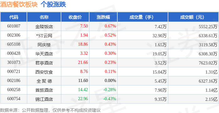 板块整体表现 - 11月3日酒店餐饮板块整体上涨1.0%,表现优于上证指数(上涨0.55%)和深证成指(上涨0.19%)[1] - 板块内多数个股录得上涨,9只成分股中有6只上涨,3只下跌[1] - 板块整体资金呈净流入状态,主力资金净流入590.38万元,而游资和散户资金分别净流出30.73万元和559.66万元[1] 领涨个股表现 - *ST云网领涨板块,收盘价1.93元,单日涨幅3.21%,成交量为45.20万手,成交额为8782.55万元[1] - 锦江酒店涨幅居前,收盘价23.06元,上涨2.44%,成交额为4.14亿元,是板块中成交额最高的个股[1] - 西安饮食上涨1.86%,收盘价8.75元,成交额为1.20亿元[1] 个股资金流向 - 锦江酒店获得主力资金最大净流入,达1598.54万元,主力净占比为4.85%[2] - 首旅酒店主力资金净流入631.99万元,主力净占比为5.53%,为板块中占比最高[2] - *ST云网主力资金净流入497.07万元,主力净占比达6.44%[2] - 金陵饭店主力资金净流出最多,为819.50万元,主力净占比为-18.79%[2] - 同庆楼主力资金净流出491.85万元,主力净占比为-16.21%[2]