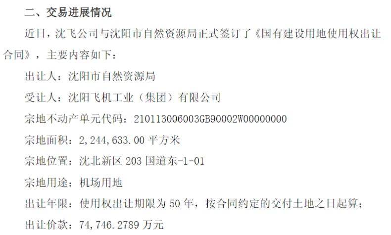 中航沈飞:子公司沈飞公司签订约7.47亿元土地出让合同