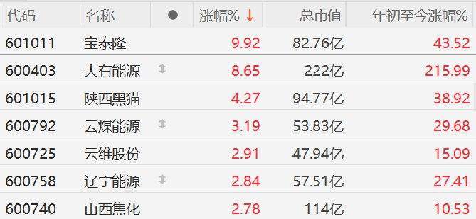 格隆汇11月5日|A股市场煤炭股逆势上涨,其中,宝泰隆(601011)涨停,大有能源(600403)涨超8%,陕 西黑猫(601015)涨超4%,云煤能源(600792)涨超3%,云维股份、辽宁能源、山西焦化(600740)涨超2%。 | 代码 | 名称 | . | 涨幅%↓ | 总市值 | 年初至今涨幅% | | --- | --- | --- | --- | --- | --- | | 601011 | 宝泰隆 | | 9.92 | 82.76亿 | 43.52 | | 600403 | 大有能源 | 4 | 8.65 | 222亿 | 215.99 | | 601015 | 陕西黒猫 | | 4.27 | 94.77亿 | 38.92 | | 600792 | 云煤能源 | 1 | 3.19 | 53.83亿 | 29.68 | | 600725 | 云维股份 | | 2.91 | 47.94亿 | 15.09 | | 600758 | 辽宁能源 | 1 | 2.84 | 57.51亿 | 27.41 | | 600740 | 山西焦化 | | 2.78 | 114亿 | 10.53 | (责任编辑:宋 ...