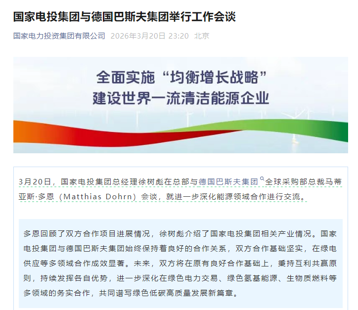 公司与合作动态 - 国家电投集团总经理徐树彪于3月20日与德国巴斯夫集团全球采购部总裁马蒂亚斯·多恩举行会谈 [1] - 双方就进一步深化能源领域合作进行交流 [1] - 未来双方将进一步深化在绿色电力交易、绿色氢基能源、生物质燃料等多领域的务实合作 [1] 行业与业务发展 - 国家电投集团与巴斯夫集团的合作聚焦于能源领域,特别是绿色能源方向 [1] - 具体合作领域包括绿色电力交易、绿色氢基能源以及生物质燃料 [1]