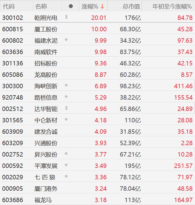 MACD金叉信号形成,这些股涨势不错! 格隆汇11月28日|A股市场福建板块快速拉升,其中,厦工股份、福建水泥、南威软件涨停,招标股 份、龙高股份、海峡创新等跟涨。消息面上,中共福建省委关于制定福建省国民经济和社会发展第十五 个五年规划的建议发布。其中提到,适度超前建设交通物流基础设施,构建立体式综合性对台通道枢 纽。推进向金门、马祖通水通电通气通桥大陆侧项目建设。深入探索两岸共同市场建设路径,优化涉台 营商环境,进一步放宽台资台企市场准入限制,强化市场规则衔接、经贸机制对接,扩大两岸标准共通 领域和适用范围,推进闽台投资贸易自由化便利化。 | 代码 | 名称 | | 涨幅% ↓ | 总市值 | 年初至今涨幅% | | --- | --- | --- | --- | --- | --- | | 300102 | 乾燥光电 | 1 | 20.01 | 176亿 | 84.78 | | 600815 | 厦工股份 | | 10.00 | 68.30亿 | 45.28 | | 600802 | 福建水泥 | -06- | 9.99 | 34.32亿 | 97.63 | | 603636 | 南威软件 | | 9.9 ...