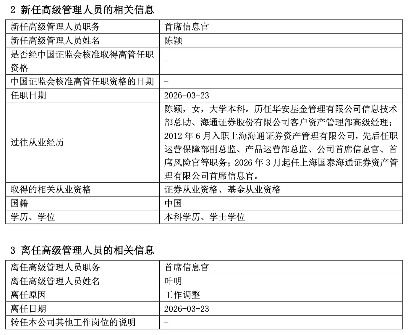 公司高管变更 - 上海国泰海通证券资产管理有限公司首席信息官发生变更,新任首席信息官为陈颖,于2026年3月23日正式任职 [1][2] - 原首席信息官叶明因“工作调整”于2026年3月23日离任,未转任公司其他岗位,离任原因属常规人事变动 [1][3] 新任高管背景 - 新任首席信息官陈颖拥有十余年金融科技与运营管理经验,过往任职经历涵盖华安基金、海通证券资管等部门 [1] - 陈颖持有证券从业资格与基金从业资格,学历为大学本科、学士学位 [1][2] - 其具体履历包括:历任华安基金管理部总助、海通证券客户资产运营保障部副总监、产品运营部总监、首席风险官等职务 [2] 变更程序与依据 - 本次高管变更依据《公开募集证券投资基金信息披露管理办法》等监管规定执行 [3] - 变更经公司第二届董事会第七十三次会议审议通过,并已按新《证券法》完成任职备案,程序合法合规 [3]
