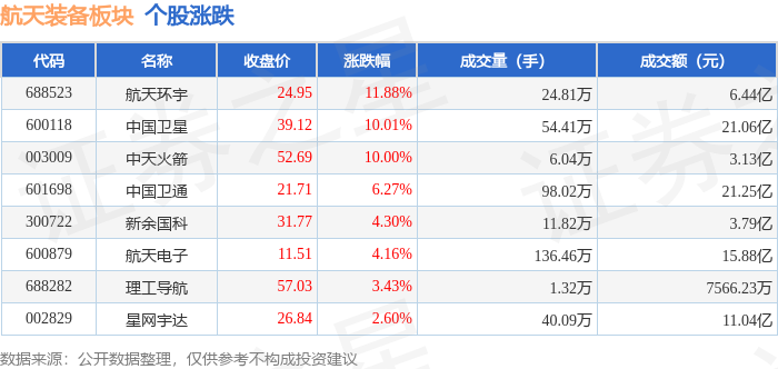 | 代码 | 名称 | 收盘价 | 涨跌幅 | 成交量(手) | 成交额(元) | | --- | --- | --- | --- | --- | --- | | 688523 | 航天坏宇 | 24.95 | 11.88% | 24.81万 | 6.44 亿 | | 600118 | 中国卫星 | 39.12 | 10.01% | 54.41万 | 21.06亿 | | 003009 | 中天火箭 | 52.69 | 10.00% | 6.04万 | 3.13亿 | | 601698 | 中国 | 21.71 | 6.27% | 1 98.02万 | 21.25亿 | | 300722 | 新会国科 | 31.77 | 4.30% | 11.82万 | 3.79 Z | | 600879 | 航天电子 | 11.51 | 4.16% | 136.46万 | 15.88 Z | | 688282 | 理工导航 | 57.03 | 3.43% | 1.32万 | 7566.23万 | | 002829 | 星网宇达 | 26.84 | 2.60% | 40.09万 | 11.04亿 | 证券之星消息,10月24 ...