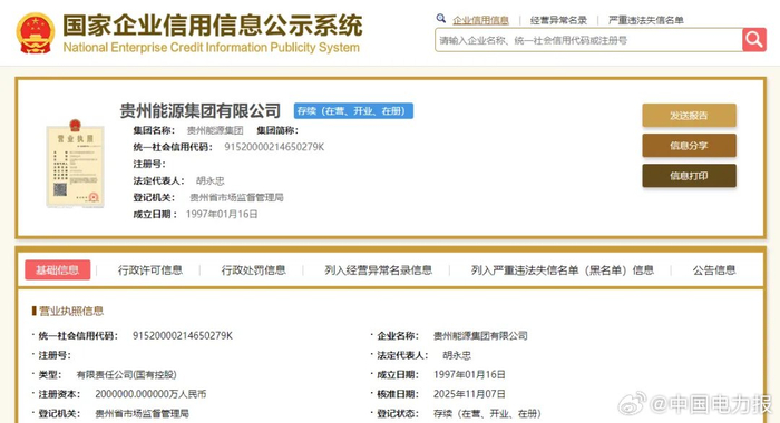 贵州能源集团注册资本翻倍至200亿元,新增西南能矿为股东