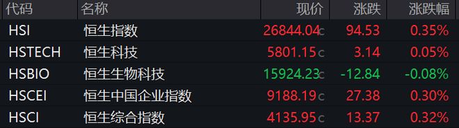 | 代码 | 名称 | 现价 | 涨跌 | 涨跌幅 | | --- | --- | --- | --- | --- | | Hટા | 恒生指数 | 26844.04c | 94.53 | 0.35% | | HSTECH | 恒生科技 | 5801.15 c | 3.14 | 0.05% | | HSBIO | 恒生生物科技 | 15924.23c | -12.84 | -0.08% | | HSCEI | 恒生中国企业指数 | 9188.19c | 27.38 | 0.30% | | HSCI | 恒生综合指数 | 4135.95c | 13.37 | 0.32% | 贵金属板块大涨,老铺黄金现涨超11%,中国白银集团涨超8%,赤峰黄金涨超7%,紫金矿业、山东黄 金、珠峰黄金、灵宝黄金、中国黄金国际等涨超5%。 科网股多数下跌,小鹏汽车跌近4%,百度集团、哔哩哔哩、快手跌超3%,蔚来、零跑汽车跌超2%;腾 讯音乐涨超3%。 1月26日,香港恒生指数开盘涨0.35%,恒生科技指数涨0.05%。 | 代码 | 名称 | 规价 | 消歧 | A 涨跌幅 | | --- | --- | --- | --- | - ...