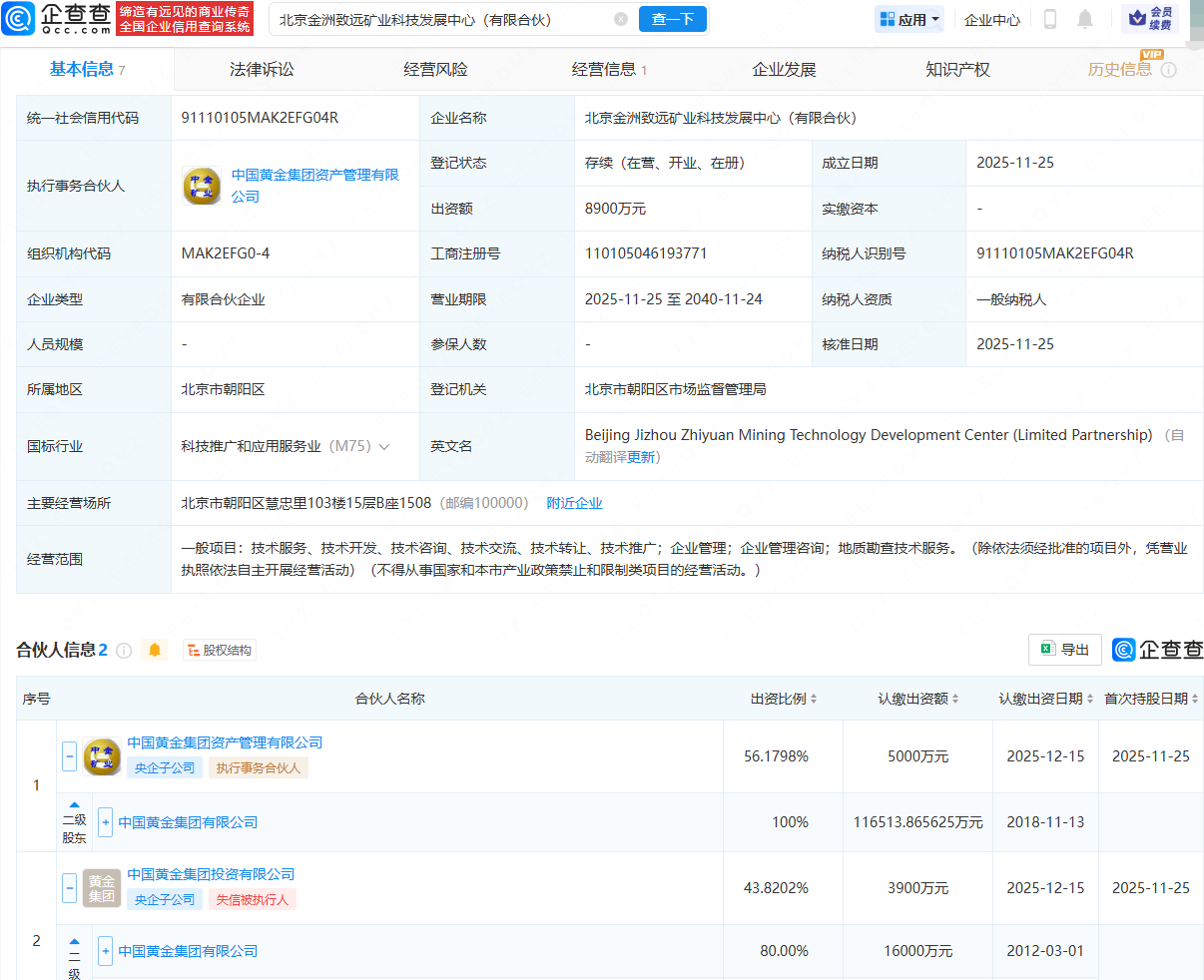 企查查APP显示,近日,北京金洲致远矿业科技发展中心(有限合伙)成立,出资额8900万元,经营范围包含:企业管理;企业管理咨询;地质勘查技术服 务等。企查查股权穿透显示,该企业由中国黄金集团有限公司旗下中国黄金集团资产管理有限公司、中国黄金集团投资有限公司共同持股。 | | 合伙人信息2 ① ♠ [E 股权结构 | | | | | 화 글버 | | --- | --- | --- | --- | --- | --- | --- | | 序号 | | | 合伙人名称 | 出资比例 ÷ | 认缴出资额 # | 认缴出资日期 : | | | | 中国黄金集团资产管理有限公司 央企子公司 执行事务合伙人 | | 56.1798% | 5000万元 | 2025-12-15 | | | -吸 股东 | 中国黄金集团有限公司 | | 100% | 116513.865625万元 | 2018-11-13 | | | 黄金 维加 | 中国黄金集团投资有限公司 央企子公司 失信被执行人 | | 43.8202% | 3900万元 | 2025-12-15 | | 2 | 11 ▶ + 级 | 中国黄金集团有限公司 | | 8 ...