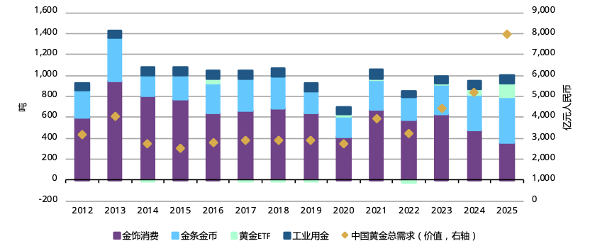 2025年中国黄金市场整体表现 - 2025年第四季度,中国市场黄金投资与消费需求总量达274吨,同比增长18%,环比大幅攀升60%,创下历年四季度第二高表现,仅次于2016年同期 [1] - 2025年全年黄金需求总量达1,003吨,同比增长6%,为2021年以来最高水平 [1] - 按金额计,2025年全年需求总额达7,960亿元人民币(约合1,110亿美元),创历史新高,同比激增53% [1] - 年内强劲的黄金投资需求抵消了金饰板块的疲软态势 [1] 金饰需求分析 - 2025年第四季度金饰需求为82吨,同比下降23%,环比下降3%,为自2007年以来表现最疲弱的四季度,较十年均值低48% [3][6] - 2025年全年金饰需求总量达360吨,同比减少25% [3] - 从消费金额看,四季度金饰支出达778亿元人民币(约合110亿美元),同比增长19%;全年累计支出2,814亿元人民币(约合394亿美元),同比增长8%,接近2023年的历史记录 [3][12] - 金饰需求疲软主要受四季度国内金价上涨12%、11月实施的黄金增值税改革、黄金周销售疲软及春节假期偏晚等因素影响 [7] - 2025年人民币金价空前上涨59%,大幅限制消费者购买力,同时经济不确定性使消费者消费态度趋于保守 [9] - 产品趋势显示,高性价比的硬足金饰品在年轻消费者中受欢迎度攀升,而高端手工古法金饰需求依然坚挺 [9] - 全年“以旧换新”业务持续火爆,有效缓解了消费者购买力不足的问题 [9] 黄金投资需求分析 - 2025年第四季度,金条金币需求量达119吨,环比激增61%,同比增长42%,创下史上第二强劲的四季度表现 [3][14] - 2025年全年,金条金币累计购入量达432吨,同比增长28%,创年度历史新高,较十年均值高出62% [3][14] - 2025年第四季度,中国黄金ETF新增流入510亿元人民币(约合72亿美元,54吨),创单季度流入规模历史最高 [3] - 2025年全年,黄金ETF资金流入量达1,100亿元人民币(约合155亿美元,133吨),创历史最佳年度表现 [3][21] - 截至2025年末,黄金ETF资产管理总规模(AUM)激增243%,升至2,418亿元人民币(约合346亿美元);持仓量增至248吨,较2024年末翻倍以上,均创历史新高 [3][21] - 投资需求强劲的驱动因素包括:人民币金价飙升带来的趋势跟随型买入、地缘政治紧张局势升级带来的避险需求、中国人民银行持续购金的公告,以及11月黄金增值税改革推动投资动机的购买者转向金条金币及黄金ETF [16][21] 央行购金动态 - 2025年第四季度,中国人民银行增持黄金2.8吨,官方黄金储备规模增至2,306吨 [4] - 2025年全年,中国人民银行累计增持黄金27吨,购金从未停歇 [4][23] - 黄金在中国总外汇储备中的占比从2024年末的5.5%升至2025年末的8.5% [23] - 2025年中国外汇储备增长8.4%,规模达3.7万亿美元 [23] - 央行购金行为反映出随着外汇储备持续扩容,中国对外汇储备多元化配置的需求上升 [24] 2026年市场展望 - 2026年第一季度,金饰消费或出现环比回升,春节旺季(季节性采购+节日购买)有望形成支撑,婚庆相关需求或能提供进一步支撑 [5][10] - 2026年全年,若金价持续高企,消费者购买力问题将继续对金饰需求吨位构成挑战,但预期中的降息及偏宽松财政政策有望提振消费者信心和可支配支出 [5][10] - 行业整合预计将持续深化,可能减少上游黄金需求,但有助于提升行业长期可持续性;硬足金饰品及高端工艺、IP主题设计在年轻买家中的需求有望增长 [10] - 2026年第一季度,黄金投资需求强劲态势或将延续,春节前夕的自我犒赏及赠礼需求有望提供支撑 [5][19] - 2026年全年,全球及区域地缘政治格局复杂多变、国内经济增长挑战、宽松货币政策降低持有黄金机会成本等因素,预计将使黄金投资需求保持强劲 [18] - 2025年监管政策调整允许中国保险资金试点进入黄金市场,截至年末已有6家保险公司加入上海黄金交易所,为机构性黄金资产配置提供长期结构性支撑 [18]