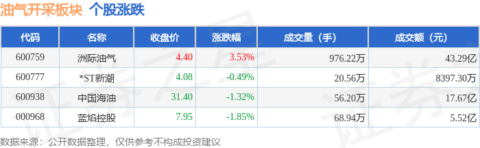 证券之星消息,1月23日油气开采板块较上一交易日下跌0.62%,蓝焰控股领跌。当日上证指数报收于 4136.16,上涨0.33%。深证成指报收于14439.66,上涨0.79%。油气开采板块个股涨跌见下表: | 代码 | 名称 | 主力净流入(元) | | | 主力净占比 游资净流入(元) 游资净占比 散户净流入(元) 散户净占比 | | | | --- | --- | --- | --- | --- | --- | --- | --- | | 000968 蓝焰控股 | | 1910.48万 | 3.46% | -1043.29万 | -1.89% | -867.18万 | -1.57% | | 600938 中国海油 | | -28.13万 | -0.02% | 2722.31万 | 1.54% | -2694.18万 | -1.52% | | 600777 | *ST新潮 | -1796.81万 | -21.40% | 495.55万 | 5.90% | 1301.26万 | 15.50% | | 600759 洲际油气 | | -6.25 Z | -14.44% | 2.43亿 | 5.60% | 3 ...