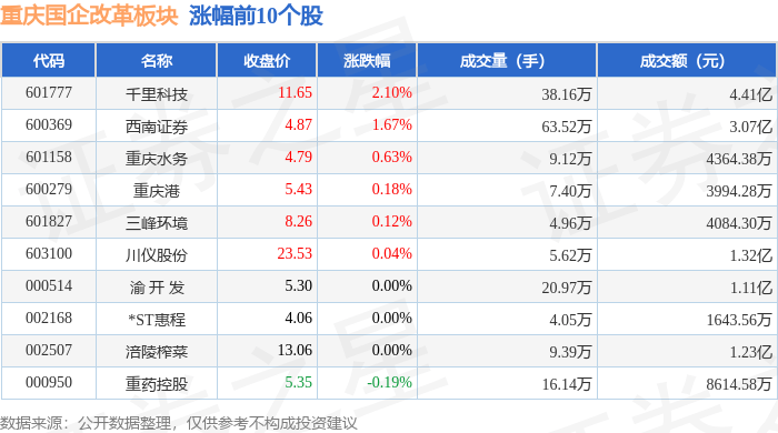 证券之星消息,10月29日重庆国企改革板块较上一交易日上涨0.89%,千里科技领涨。当日上证指数报 收于4016.33,上涨0.7%。深证成指报收于13691.38,上涨1.95%。重庆国企改革板块个股涨跌见下表: | 代码 | 名称 | 收盘价 | 涨跌幅 | 成交量(手) | 成交额(元) | | --- | --- | --- | --- | --- | --- | | 601777 | 千里科技 | 11.65 | 2.10% | 38.16万 | 4.41亿 | | 600369 | 西南证券 | 4.87 | 1.67% | 63.52万 | 3.07亿 | | 601158 | 重庆水务 | 4.79 | 0.63% | 9.12万 | 4364.38万 | | 600279 | 重庆港 | 5.43 | 0.18% | 7.40万 | 3994.28万 | | 601827 | 三峰环境 | 8.26 | 0.12% | 4.96万 | 4084.30万 | | 603100 | 川仪服务 | 23.53 | 0.04% | 5.62万 | 1.32亿 | | 000514 | 渝开发 | 5 ...