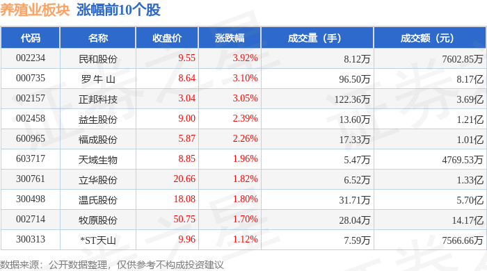 证券之星消息,11月28日养殖业板块较上一交易日上涨1.46%,民和股份领涨。当日上证指数报收于 3888.6,上涨0.34%。深证成指报收于12984.08,上涨0.85%。养殖业板块个股涨跌见下表: | 代码 | 名称 | 收盘价 | 涨跌幅 | 成交量(手) | 成交额(元) | | | --- | --- | --- | --- | --- | --- | --- | | 002234 | 民和股份 | 9.55 | 3.92% | 8.12万 | | 7602.85万 | | 000735 | 罗牛山 | 8.64 | 3.10% | 96.50万 | | 8.17亿 | | 002157 | 正邦科技 | 3.04 | 3.05% | 122.36万 | | 3.69亿 | | 002458 | 益生股份 | 9.00 | 2.39% | 13.60万 | | 1.21亿 | | 600965 | 福成股份 | 5.87 | 2.26% | 17.33万 | | 1.01亿 | | 603717 | 天域生物 | 8.85 | 1.96% | 5.47万 | | 4769.53万 | | 3007 ...