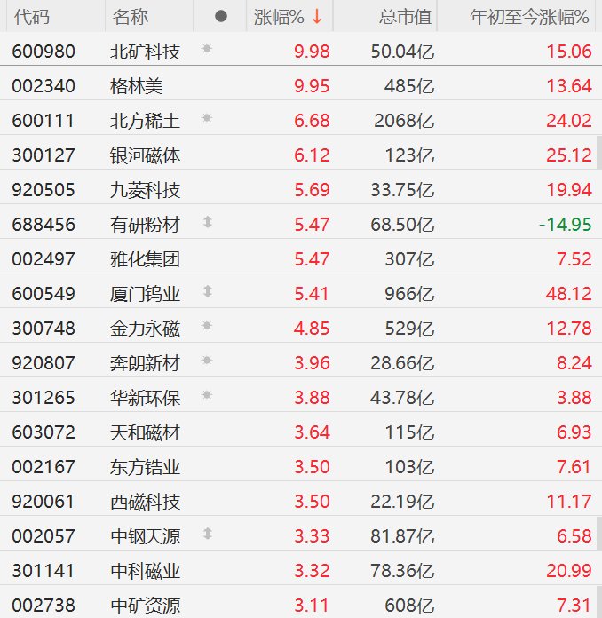 A股异动丨主流产品价格整体上行!稀土股集体走强,北方稀土、银河磁体涨超6%