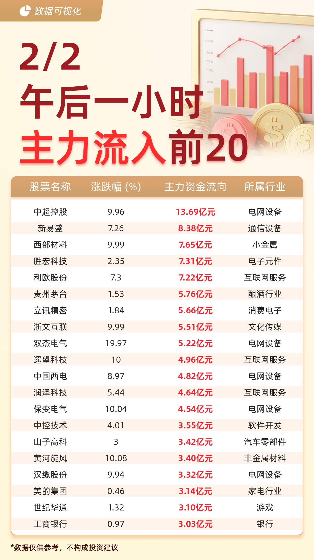 主力资金流入概况 - 截至2月2日午后一小时,主力资金流入前20的股票名单及金额公布,其中中超控股以13.69亿元居首,新易盛、西部材料、胜宏科技、利欧股份紧随其后,流入金额分别为8.38亿元、7.65亿元、7.31亿元、7.22亿元 [1] 电网设备行业 - 中超控股主力资金流入13.69亿元,股价上涨9.96% [2] - 双杰电气主力资金流入5.22亿元,股价大幅上涨19.97% [2] - 中国西电主力资金流入4.82亿元,股价上涨8.97% [2] - 保变电气主力资金流入4.54亿元,股价上涨10.04% [3] - 汉缆股份主力资金流入3.32亿元,股价上涨9.94% [3] 通信设备行业 - 新易盛主力资金流入8.38亿元,股价上涨7.26% [2] 小金属行业 - 西部材料主力资金流入7.65亿元,股价涨停,上涨9.99% [2] 电子元件行业 - 胜宏科技主力资金流入7.31亿元,股价上涨2.35% [2] 互联网服务行业 - 利欧股份主力资金流入7.22亿元,股价上涨7.3% [2] - 遥望科技主力资金流入4.96亿元,股价涨停,上涨10% [2] - 润泽科技主力资金流入4.64亿元,股价上涨5.44% [3] 酿酒行业 - 贵州茅台主力资金流入5.76亿元,股价上涨1.53% [2] 消费电子行业 - 立讯精密主力资金流入5.66亿元,股价上涨1.84% [2] 文化传媒行业 - 浙文互联主力资金流入5.51亿元,股价涨停,上涨9.99% [2] 软件开发行业 - 中控技术主力资金流入3.55亿元,股价上涨4.01% [3] 汽车零部件行业 - 山子高科主力资金流入3.42亿元,股价上涨3% [3] 非金属材料行业 - 黄河旋风主力资金流入3.40亿元,股价上涨10.08% [3] 家电行业 - 美的集团主力资金流入3.14亿元,股价上涨0.46% [3] 游戏行业 - 世纪华通主力资金流入3.10亿元,股价上涨1.32% [3] 银行行业 - 工商银行主力资金流入3.03亿元,股价上涨0.97% [3]