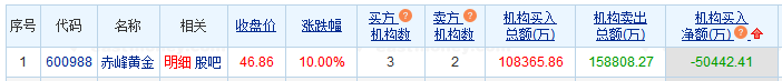 赤峰黄金涨停 机构净卖出5.04亿元