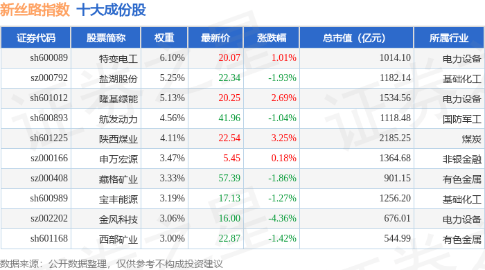 | 证券代码 | 股票简称 | 权重 | 最新价 | 涨跌幅 | 总市值(亿元) | | 所属行业 | | --- | --- | --- | --- | --- | --- | --- | --- | | sh600089 | 特变电工 | 6.10% | 20.07 | 1.01% | | 1014.10 | ■ 电力设备 | | sz000792 | 盐湖股份 | 5.25% | 22.34 | -1.93% | | 1182.14 | 墓础化工 | | sh601012 | 隆基绿能 | 5.13% | 20.25 | 2.69% | 4 | 1534.56 | 电力设备 | | sh600893 | 航发动力 | 4.56% | 41.96 | -1.04% | S | 1118.48 | 国防军工 | | sh601225 | 陕西煤业 | 4.11% | 22.54 | 3.25% | | 2185.25 | 煤炭 | | sz000166 | 申万宏源 | 3.47% | 5.45 | 0.18% | | 1364.68 | 非银金融 | | sz000408 | 藏格矿业 | 3.33% | ...