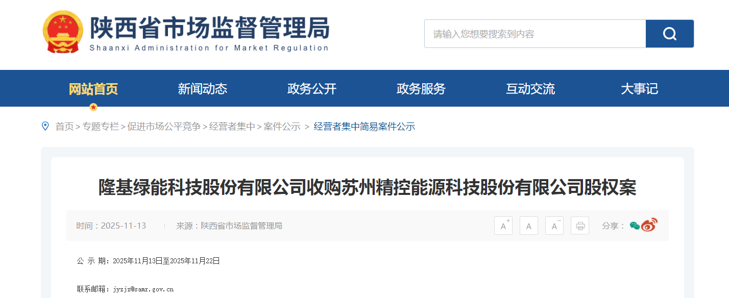 隆基绿能科技股份有限公司收购苏州精控能源科技股份有限公司股权案
