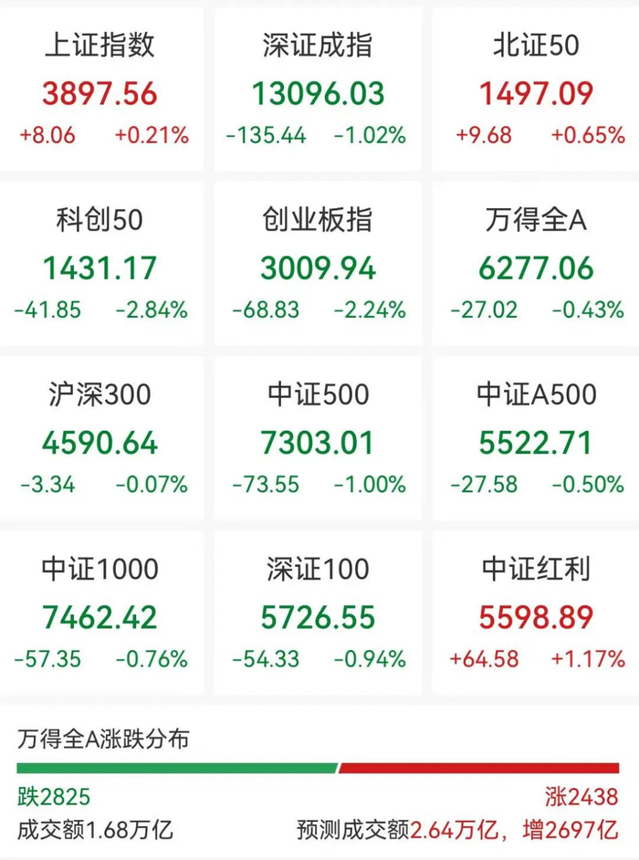 市场整体表现 - 沪深两市成交额达2.58万亿元,较上一交易日放量2215亿元 [1][4] - 三大指数高开低走,沪指跌0.62%至3865.23点,深成指跌2.54%至12895.11点,创业板指跌3.99%至2955.98点,科创50指数跌超4.26%至1410.30点 [1][2] - 全市场超3500只个股下跌 [1][4] 行业板块表现 - 科技股显著回调,半导体芯片股集体调整,通富微电跌停,芯源微、燕东微、华海清科等多股跌超10% [2][3] - 保险、银行等金融股逆势走强,重庆银行涨超6%,渝农商行、新华保险涨超5%,中国人保、厦门银行等涨幅居前 [2][3] - 超硬材料概念集体大涨,白酒、金融、煤炭等传统行业走强 [2] 资金流向 - 主力资金全天净流入银行、食品饮料、煤炭等板块,净流出半导体、通信设备、电池等板块 [6] - 隆基绿能、山子高科、工商银行分别获主力资金净流入15.27亿元、10.32亿元、7.57亿元 [6] - 中芯国际、北方稀土、宁德时代遭主力资金抛售25.98亿元、19.05亿元、18.15亿元 [6] 机构观点 - 市场在资金回流与重要会议召开后,或有打破盘整结构挑战新高的可能,中期向上趋势不变 [8] - 白酒行业需求端处于盘底阶段,等待下轮成长周期 [8] - 有色金属与化工行业在三季报中表现突出,多家企业净利润实现成倍提升,建议关注较早披露财报且业绩超预期的公司 [8]