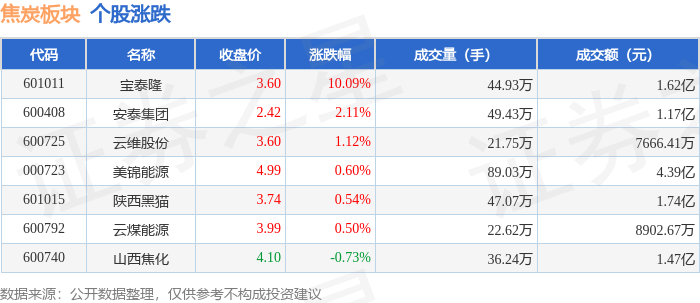 证券之星消息,10月10日焦炭板块较上一交易日上涨2.59%,宝泰隆领涨。当日上证指数报收于 3897.03,下跌0.94%。深证成指报收于13355.42,下跌2.7%。焦炭板块个股涨跌见下表: | 代码 | 名称 | 收盘价 | 涨跌幅 | 成交量(手) | 成交额(元) | | | --- | --- | --- | --- | --- | --- | --- | | 601011 | 宝泰隆 | 3.27 | 10.10% | 83.53万 | | 2.70亿 | | 601015 | 陕西黑猫 | 3.72 | 4.49% | 70.57万 | | 2.63 乙 | | 600792 | 云煤能源 | 3.97 | 3.93% | 36.27万 | | 1.43亿 | | 600408 | 安泰集团 | 2.37 | 2.60% | 52.64万 | | 1.26亿 | | 600740 | 山西焦化 | 4.13 | 1.47% | 51.46万 | | 2.12亿 | | 600725 | 云维股份 | 3.56 | 0.85% | 21.95万 | | 7827.42万 | | 000723 ...