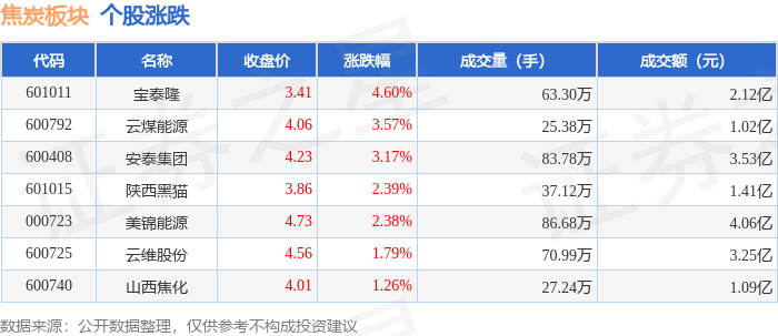 从资金流向上来看,当日焦炭板块主力资金净流入1.08亿元,游资资金净流出2826.33万元,散户资金净 流出7941.63万元。焦炭板块个股资金流向见下表: | 代码 | 名称 | 主力净流入 (元) | 主力净占比 游资净流入 (元) | | 游资净占比 散户净流入 (元) | | 散户净占比 | | --- | --- | --- | --- | --- | --- | --- | --- | | 600725 | 云维股份 | 3044.66万 | 9.36% | -498.74万 | -1.53% | -2545.92万 | -7.83% | | 600408 | 安泰隼团 | 2425.34万 | 6.87% | 1357.72万 | 3.85% | -3783.06万 | -10.72% | | 000723 美锦能源 | | 2292.91万 | 5.64% | -3198.91万 | -7.87% | - 906.00万 | 2.23% | | 601011 | 宝泰隆 | 2130.81万 | 10.05% | -1074.29万 | -5.07% | -1056.51万 | -4.98% ...