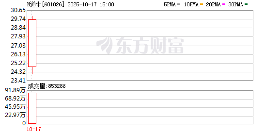 统计显示,公司本次发行总量为1.32亿股,其中,网上发行量为7212.90万股,发行价格为5.98元/股, 发行市盈率29.05倍,行业平均市盈率27.90倍,网上发行最终中签率为0.04220717%。公司首发募资金 额为7.89亿元,募资主要投向年产7.8万吨新能源及动力电池用等高端胶粘剂、高性能复合材料树脂系统 项目、偿还银行贷款及补充流动资金等。(数据宝) 今日上市新股表现 | 代码 | 简称 | 最新价(元) | 收盘涨跌幅(%) | 首日换手率(%) | | --- | --- | --- | --- | --- | | 601026 | N道生 | 29.68 | 396.32 | 79.61 | (文章来源:证券时报网) N道生(601026)今日上市,开盘上涨314.21%,截至收盘涨幅扩大至396.32%,全天成交量8532.86万股, 成交额23.01亿元,换手率79.61%。 公司主营业务为以环氧树脂、聚氨酯、丙烯酸酯和有机硅等为基础原材料的高性能热固性树脂系统料产 品的研发、生产和销售。 ...
