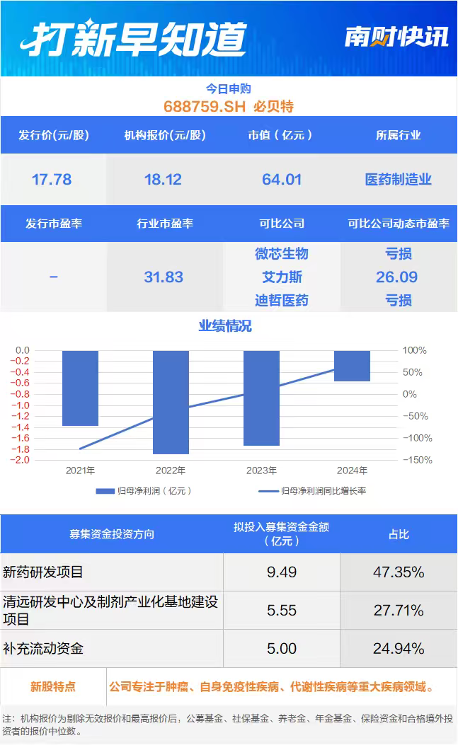 | 今日申购 | | | | | --- | --- | --- | --- | | 688759.SH 必贝特 | | | | | 发行价(元/股) | 机构报价(元/股) | 市值(亿元) | 脱属行业 | | 17.78 | 18.12 | 64.01 | 医药制造业 | | 发行市盈率 | 行业市盈率 | 可比公司 | 可比公司动态市盈率 | | 31.83 | | 微芯生物 | 亏损 | | | | 艾力斯 | 26.09 | | | | 迪梅居药 | 亏损 | | 业绩情况 | | | | | 0.0 | | | 100% | | -0.2 | | | | | -0.4 | | | 50% | | -0.6 | | | | | -0.8 | | | 0% | | -1.0 | | | | | -1.2 | | | -50% | | -1.4 | | | | | -1.6 | | | -100% | | -1.8 | | | | | -2.0 | | | -150% | | 2021年 | 2022年 | 2023年 | 2024年 | | 归母净利润(亿元) | | ·归母净利润同比增长率 | | ...