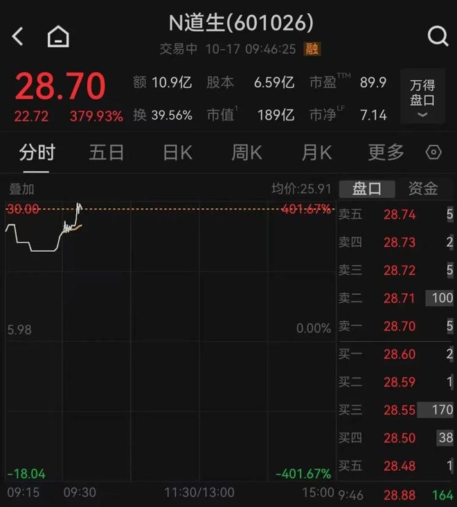 业绩方面,2022年、2023年、2024年及2025年1-6月, 道生天合 营业收入 分别为34.36亿元、 32.02亿元、32.38亿元及17.85亿元, 净利润 分别为1.08亿元、1.52亿元、1.55亿元及0.85亿元。 微信编辑 |钉钉 据悉, 道生天合是一家致力于新材料的研发、生产和销售的国家级高新技术企业。产品主要围绕环氧 树脂、聚氨酯、丙烯酸酯和有机硅等高性能热固性树脂材料,形成了风电叶片用材料、新型复合材料用 树脂和新能源汽车及工业胶粘剂三大系列产品。 10月17日,新股N道生高开超314%,盘初一度涨超400%;截至发稿,该股涨近380%,报28.7元/ 股。 | < 日 | | N道生(601026) 交易中 10-17 09:46:25 融 | | | | --- | --- | --- | --- | --- | | 28.70 | | 额 10.9亿 股本 6.59亿 市盈 89.9 | 万得 | | | | | | 智口 | | | | | 22.72 379.93% 换 39.56% 市值 189亿 市净" 7.14 | | | | 分时 | 五目 | 周K 月K | 中文 ...