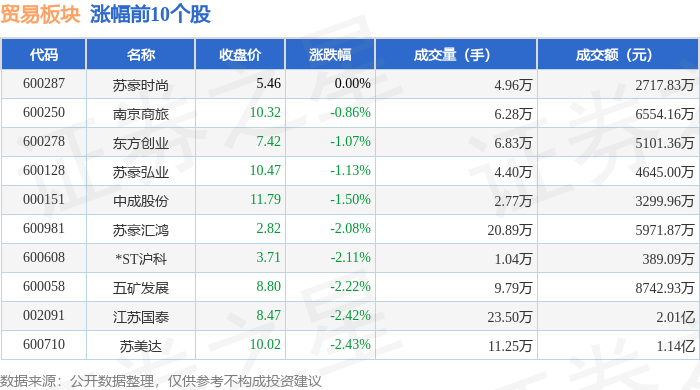 | 代码 | 名称 | 收盘价 | 涨跌幅 | 成交量(手) | 成交额(元) | | --- | --- | --- | --- | --- | --- | | 002072 | 凯瑞德 | 7.38 | 2.07% | 4.56万 | 3334.44万 | | 600250 | 南京商旅 | 10.58 | 1.83% | 7.02万 | 7379.22万 | | 600981 | 示索汇鸿 | 2.90 | 1.40% | 22.97万 | 6654.80万 | | 601061 | 中信金属 | 10.49 | 1.35% | 32.19万 | 3.34亿 | | 600287 | 亦蒙时尚 | 5.51 | 1.29% | 5.58万 | 3053.66万 | | 002183 | 怡亚通 | 5.18 | 1.17% | 53.89万 | 2.77亿 | | 600128 | 苏蒙弘业 | 10.69 | 1.14% | 4.66万 | 4975.92万 | | 600278 | 东方创业 | 7.50 | 0.94% | 5.62万 | 4201.83万 | | 002091 | 江苏国泰 | ...