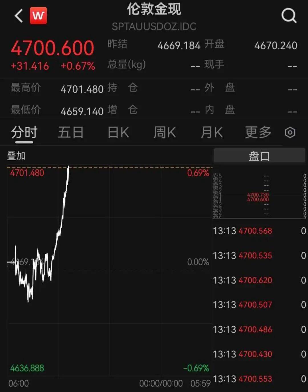 1月20日午后,现货黄金突然直线拉升,历史首次站上4700美元/盎司,截至发稿,报4700.60美元/盎司。 | < W | 伦敦金现 | | | | | | | --- | --- | --- | --- | --- | --- | --- | | SPTAUUSDOZ.IDC | | | | | | | | 4700.600 | 昨结 | 4669 184 十益 | | | 4670.240 | | | +31.416 +0.67% | 总量(kq) | -- 现手 | | | | | | 最高价 4701 480 守 | එ | | | | | | | 最低价 4659 140 瑞 | | K | | | | | | 分时 五日 | 目K | 園K | 月K | | 自名 | | | 叠加 | | | | | | | | 4701.480 | | | 0 499 | | | | | | | | | 13:13 4700.568 | | 0 | | | | | 11 1 1 1 5 4 5 4 4 1 1 6 4 4 1 1 6 4 4 1 1 6 4 1 1 6 4 1 1 6 4 1 1 6 4 1 ...