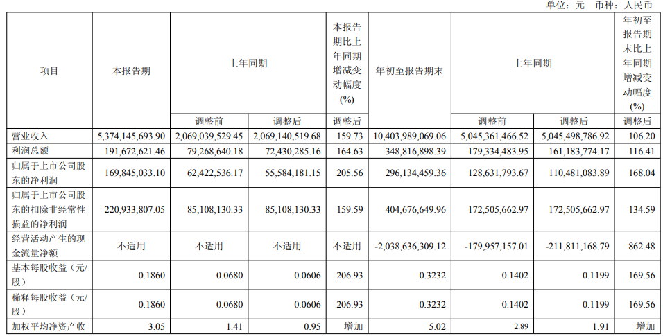 | | | | | | | | 早刊:儿 几个:八代日 | 年初至 | | --- | --- | --- | --- | --- | --- | --- | --- | --- | | 项目 | 本报告期 | 上年同期 | | 本报告 期比上 年同期 增减变 | 年初至报告期末 | 上年同期 | | 报告期 增减变 | | | | | | | | | | 末比上 | | | | | | | | | | 年同期 | | | | | | 动幅度 | | | | | | | | | | | | | | 动幅度 | | | | | | (%) | | | | (%) | | | | 调整前 | 调整后 | 调整后 | | 调整前 | 调整后 | 调整后 | | 营业收入 | 5,374,145,693.90 | 2,069,039,529.45 | 2,069,140,519.68 | 159.73 | 10,403,989,069.06 | 5,045,361,466.52 | 5,045,498,786.92 | 106.20 | | 利润总额 | 191,672,621.46 | 79,268,640.18 ...