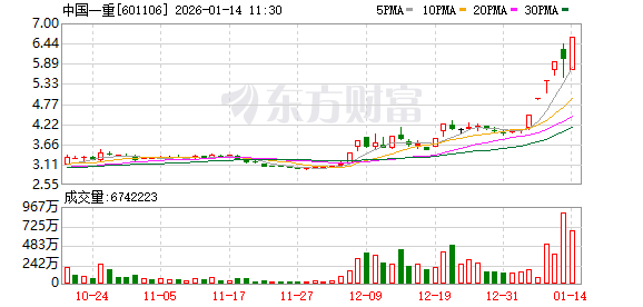 中国一重再度涨停,6个交易日内录得5个涨停,累计涨幅为62.56%,累计换手率为39.47%。截至 11:06,该股今日成交量6.47亿股,成交金额40.82亿元,换手率9.44%。最新A股总市值达452.61亿元。 证券时报·数据宝统计,两融数据来看,该股最新(1月13日)两融余额为6.22亿元,其中,融资余额 6.03亿元,较前一个交易日增加1.07亿元,环比增长21.49%,近6日累计增加6369.19万元,环比增长 11.81%。 | 日期 | 当日涨跌幅(%) | 换手率(%) | 主力资金净流入(万元) | | --- | --- | --- | --- | | 2026.01.13 | 0.84 | 13.09 | -98270.99 | | 2026.01.12 | 9.98 | 5.57 | -21115.22 | | 2026.01.09 | 9.96 | 7.32 | 8055.97 | | 2026.01.08 | 10.07 | 1.40 | 18260.79 | | 2026.01.07 | 10.10 | 2.65 | 29364.39 | | 2026.01.06 | 0.74 ...