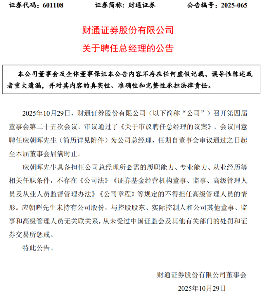 近日,财通证券(601108.SH)公告称,正式聘任应朝晖为公司总经理。 业界对应朝晖此次履新并不意外,早在今年8月,财通证券已披露,决定应朝晖任公司党委副书记,提名其为公司总经理人选。 从公开履历来看,应朝晖具备丰富的实战经验,早年深耕浙江省内金融体系,曾任浙江省农信联社党委委员、副主任,浙江农商联合银行党委委员、副行 长,还曾担任浙江省担保集团党委书记、董事长。现任财通证券党委副书记、总经理、董事。 财通证券发布的2025年三季度报告显示,前三季度,财通证券实现营业收入50.63亿元,同比增长13.99%,归母净利润20.38亿元,同比增长38.42%。其中, 第三季度营收、净利润实现大幅增长,同比增幅分别达48.58%、75.10%。 业内人士认为,财通证券此次总经理聘任落地,不仅填补了长达一年的核心管理岗位空缺,更标志着公司"董事长统筹+总经理执行"的治理架构正式回归常 态,为后续战略落地提供了关键组织保障,叠加三季度业绩大幅反弹,公司已迎来经营层面"拐点"。 总经理聘任落地 10月29日晚间,财通证券公告,公司第四届董事会第二十五次会议审议通过了《关于审议聘任总经理的议案》,同意聘任应朝晖为公司总经 ...