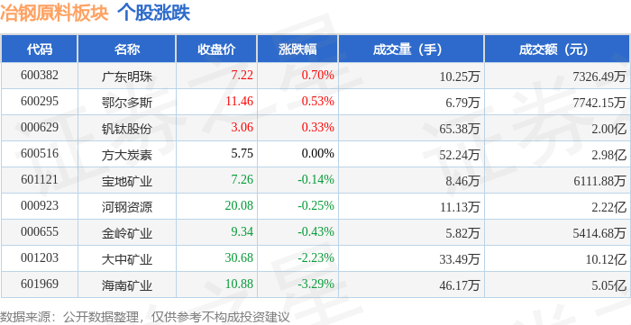 | 代码 | 名称 | 收盘价 | 涨跌幅 | 成交量(手) | 成交额(元) | | --- | --- | --- | --- | --- | --- | | 600382 | 广东明珠 | 7.22 | 0.70% | 10.25万 | 7326.49万 | | 600295 | 鄂尔多斯 | 11.46 | 0.53% | 6.79万 | 7742.15万 | | 000629 | 钢钛股份 | 3.06 | 0.33% | 65.38万 | 2.00亿 | | 600516 | 方大炭素 | 5.75 | 0.00% | 52.24万 | 2.9867 | | 601121 | 宝地矿业 | 7.26 | -0.14% | 8.46万 | 6111.88万 | | 000923 | 河钢资源 | 20.08 | -0.25% | 11.13万 | 2.22亿 | | 000655 | 等龄矿业 | 9.34 | -0.43% | 5.82万 | 5414.68万 | | 001203 | 大中矿业 | 30.68 | -2.23% | 33.49万 | 10.12亿 | | 696109 | 海南矿 ...