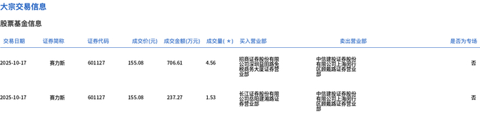 10月17日,赛力斯大宗交易成交6.09万股,成交额943.88万元,占当日总成交额的0.21%,成交价155.08 元,较市场收盘价155.08元持平。 | 交易日期 | 证券简称 | 证券代码 | 成交价(元) 成交金额(万元) 成交量( *) 买入营业部 | | | | 类出管业部 | 是否为专场 | | --- | --- | --- | --- | --- | --- | --- | --- | --- | | 2025-10-17 | 赛力斯 | 601127 | 155.08 | 706.61 | 4.56 | 第一届出版 或名词语大家 AT 2 | 期 - 11 | 客 | | 2025-10-17 | 孫力斯 | 601127 | 155.08 | 237.27 | 1.53 | 菜品管理廠選擇整 | 重量量 | Ka | ...