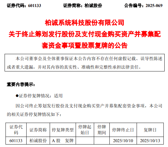 交易终止公告 - 公司股票自10月13日开市起复牌 [1] - 公司终止筹划发行股份及支付现金购买资产并募集配套资金事项 [1] 原交易方案概述 - 公司原拟以发行股份及支付现金方式购买交易对方持有的上海灿实工程设备有限公司55%股份 [1] - 交易对方为周华杰、台庆、白凌云、灿朋科技发展(上海)合伙企业(有限合伙) [1] - 公司与交易对方于9月29日签署了《投资合作框架协议》 [1] - 公司股票自9月30日开市起停牌 [1] 交易终止原因 - 终止原因为双方未能就本次交易方案所涉部分核心条款最终达成一致意见 [1] - 终止筹划经公司研究及与交易对方协商同意 [1] 交易终止影响 - 终止筹划本次交易事项不会对公司业务开展、经营活动和财务状况造成不利影响 [1]