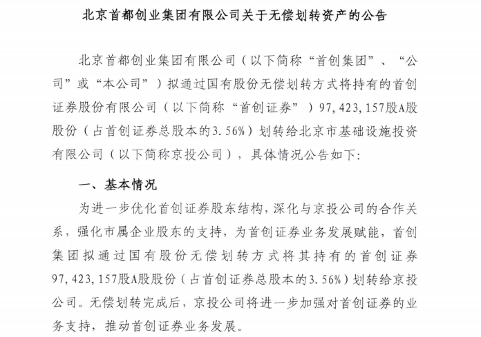 10月15日,北京首都创业集团有限公司(以下简称首创集团)拟通过国有股份无偿划转方式,将其持有的首创证券9742.316万股A股股份 (占 首创证券 总股本的3.56%)划转给北京市基础设施投资有限公司(以下简称京投公司)。 【 导读 】首创集团无偿划转首创证券部分股权 给 京投公司 中国基金报记者 孙越 大股东未变,二股东持股比例上升 根据公告,本次划转实施前,首创集团直接持有首创证券56.77%的股权,为公司控股股东;京投公司持股比例为17.31%,为第二大股 东。划转完成后,首创集团持股比例将降至53.20%,仍保持控股地位;京投公司持股比例将提升至20.87%,仍为首创证券第二大股东。 据悉,此次划转旨在进一步优化首创证券的股东结构,深化与京投公司的战略合作关系,强化市属企业股东对首创证券的支持,为其业务 发展注入新动能。 首创集团表示,本次无偿划转不会对公司的日常管理、生产经营及偿债能力产生不利影响。目前,双方已签署股份无偿划转协议,相关事 项尚待北京市国资委批准、上海证券交易所合规性确认及中国证券登记结算有限责任公司办理完成股份登记过户等手续。 今年7月,首创证券公告称,计划发行H股并在港交所主板 ...