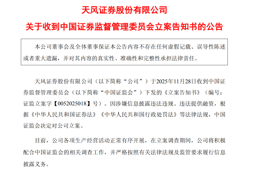 中经记者 罗辑 北京报道 11月28日晚间,天风证券公告称,公司于当日收到中国证监会下发的《立案告知书》。因涉嫌信息披露 违法违规、违法提供融资,中国证监会决定对其立案。 上述公告并未提及两项违法行为的具体情况,业界猜测,此次立案或与三年前年报披露的原民营大股东 资金占用事项有所关联。 天风证券曾在2023年收到上交所《关于天风证券股份有限公司2022年年度报告的信息披露监管工作函》 (以下简称"《工作函》"),涉及非经营性资金占用问题。彼时原持有天风证券5%以上股份的股东当 代科技产业集团股份有限公司及其关联方(以下简称"当代集团")存在通过第三方占用天风证券资金的 情况。 有匿名人士认为,此次立案,或许将令天风证券彻底卸下历史包袱,有利于其轻装前进。 今年以来,天风证券已数次因合规问题收到监管罚单。2月,上海证监局公告,天风(上海)证券资产 管理有限公司因在从事资产证券化业务中存在违规情形,被监管采取出具警示函的行政监管措施。7月 和9月,天风证券又因下属营业部存在合规问题,分别被重庆证监局、山东证监局出具警示函和责令改 正。 民营大股东曾存资金占用问题 据公告披露,《工作函》提出,据天风证券2022年年 ...