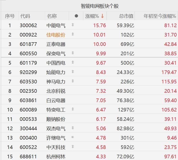 (责任编辑:宋政 HN002) 【免责声明】本文仅代表作者本人观点,与和讯网无关。和讯网站对文中陈述、观点判断保持中立,不对所包含内容的 准确性、可靠性或完整性提供任何明示或暗示的保证。请读者仅作参考,并请自行承担全部责任。邮箱: news_center@staff.hexun.com 格隆汇11月6日|A股市场智能电网股今日继续走强,其中,中能电气(300062)涨超15%,佳电股份 (000922)、正泰电器(601877)、保变电气(600550)10CM涨停,中国西电(601179)逼近涨停,灿能电力涨超 8%,神马电力(603530)、北京科锐(002350)、白云电器(603861)涨超7%,特变电工(600089)、顺钠股份 (000533)涨超6%,双杰电气(300444)涨超5%。 | | | | | 智能电网板块个股 | | | | --- | --- | --- | --- | --- | --- | --- | | 序号 | 代码 | 名称 | 0 | 涨幅% ↓ | 总市值 | 年初至今涨幅% | | 1 | 300062 | 中能电气 | 中 | 15.76 | 59.39亿 | ...