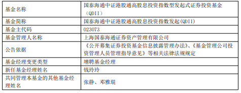 中国经济网北京12月19日讯 今日,国泰海通证券资产管理有限公司公告,国泰海通中证港股通高股息 投资指数发起(QDII)、国泰海通中证香港科技指数发起(QDII)增聘钱玲玲。 钱玲玲历任上海海通证券资产管理有限公司权益投资二部投资经理助理、权益二部投资经理、公募权益 部总监助理,2025年11月加入上海国泰海通证券资产管理有限公司,现任综合策略投资部基金经理。 国泰海通中证香港科技指数发起(QDII)A/C成立于2024年10月8日,截至2025年12月18日,其今年来 收益率为18.24%、18.07%,成立来收益率为12.52%、12.30%,累计净值为1.1252元、1.1230元。 | 基金名称 | 国泰海通中证港股通高股息投资指数型发起式证券投资基金 | | --- | --- | | | (QDII) | | 基金简称 | 国泰海通中证港股通高股息投资指数发起(QDII) | | 基金主代码 | 023073 | | 基金管理人名称 | 上海国泰海通业券资产管理有限公司 | | 公告依据 | 《公开募集证券投资基金信息披露管理办法》、《基金管理公司投 资管理人员管理指导意见》等相关法律法规规定 | ...
