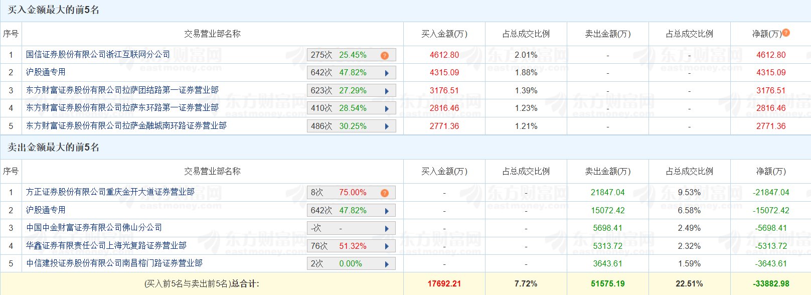 股价与交易表现 - 公司股票今日跌停,换手率为5.24%,成交额达22.92亿元 [1] - 龙虎榜数据显示,上榜席位全天合计净卖出3.39亿元,其中买入1.77亿元,卖出5.16亿元 [1] 主要资金流向 - 沪股通资金呈现净卖出状态,买入4315.09万元,卖出1.51亿元,净卖出额为1.07亿元 [1] - 游资“涪陵广场路”位列卖一席位,净卖出金额为2.18亿元 [1] - 买入前五名营业部合计买入1.77亿元,占总成交比例的7.72% [2] 买入席位分析 - 国信证券浙江互联网分公司为最大买入方,买入金额4612.80万元,占总成交2.01% [1] - 沪股通专用席位买入4315.09万元,占总成交1.88% [1] - 东方财富证券旗下三家营业部位列买入第三至第五名,买入金额在2771.36万元至3176.51万元之间,合计占总成交约3.83% [1]